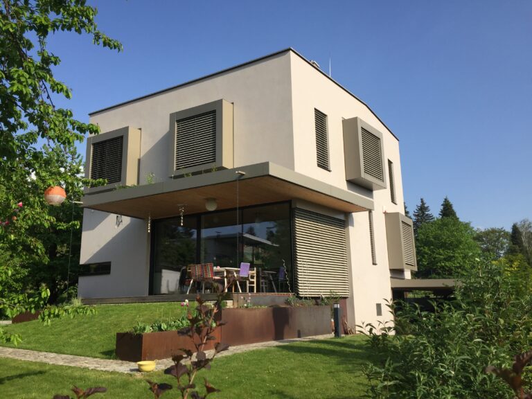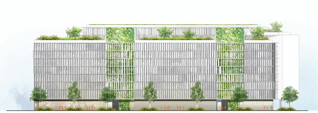 Ein zentraler Bestandteil ist die Begrünung. Neben einer Parkanlage mit heimischer Bepflanzung und Spielbereichen sind intensiv begrünte Dachgärten mit Hochbeeten und Aufenthaltsflächen geplant. Fassadenbegrünung, bepflanzte Innenhöfe und hängende Gärten an den Balkonen verbessern das Mikroklima und stärken den grünen Charakter des Quartiers.