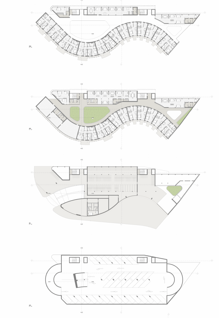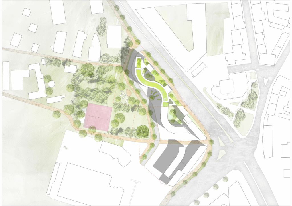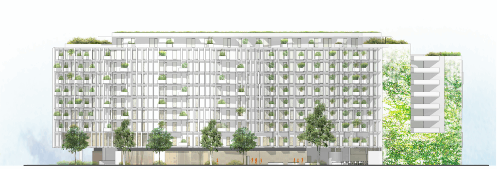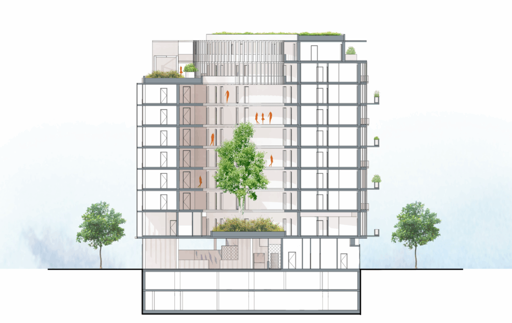 Die Bebauung folgt der Straßenflucht und integriert in den Erdgeschoßzonen urbane Nutzungen wie Geschäfte, Gastronomie und Büros. Dahinter entsteht eine parkorientierte Wohnbebauung entlang einer durchgehenden Grünzone („grüne Welle“). Die geschwungene Fassadenlinie und vorgelagerte Pawlatschenhöfe schaffen Aufenthaltsqualität und fördern Begegnung und Austausch.
