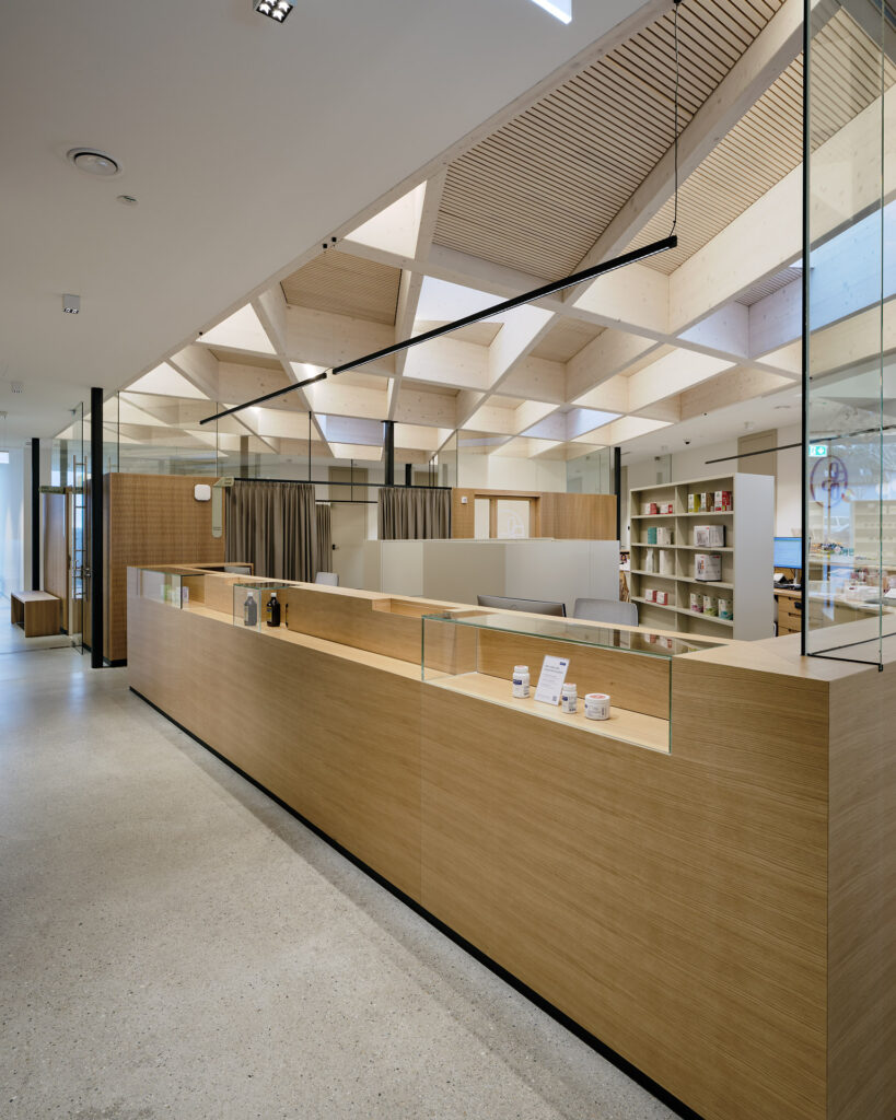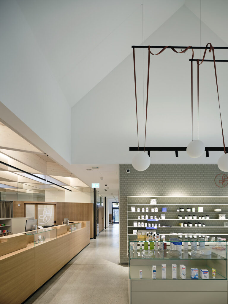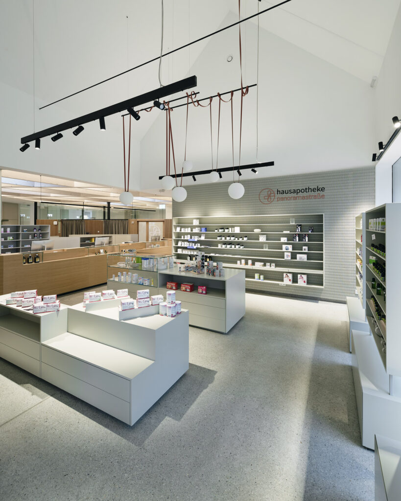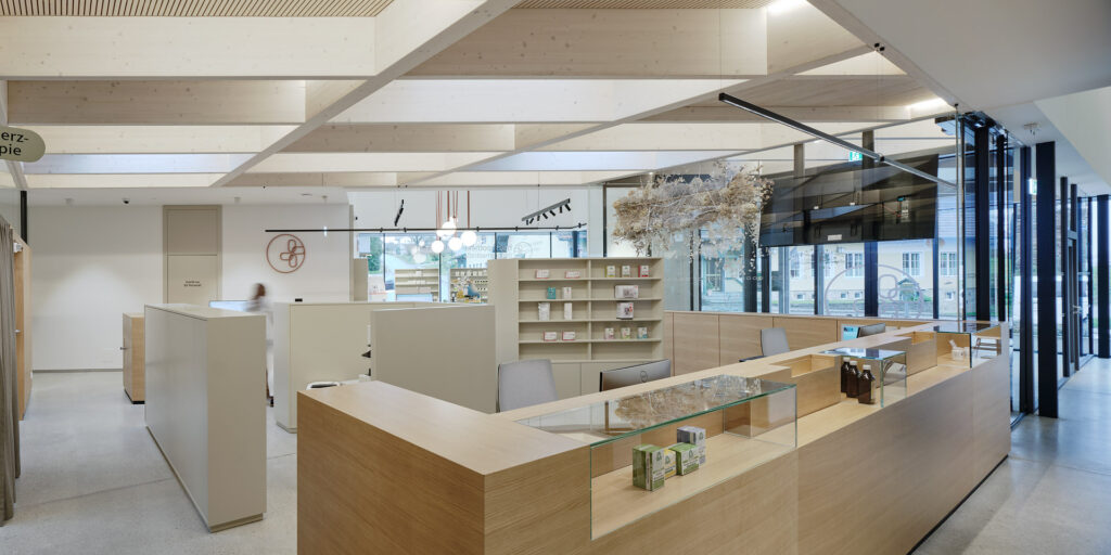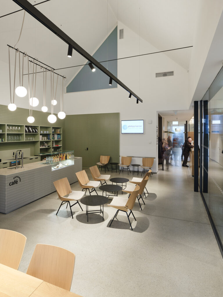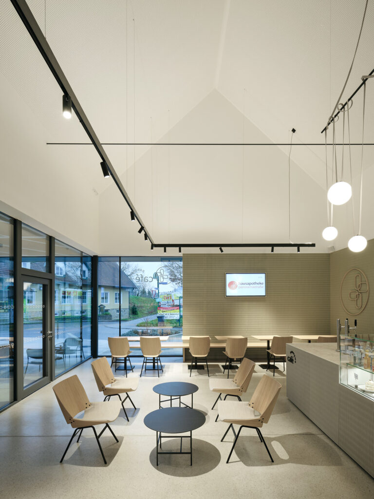 Die markante Lage an einer wichtigen Straßenkreuzung sowie die Funktionen der Nachbarschaft – Radwanderweg, Nahversorgung, Vereinshalle – lieferten entscheidende Impulse für die Gestaltung. Besucher- und Patientenbereiche sind klar und effizient im Erdgeschoss organisiert, mit einem zentralen Empfangs-, Arbeits- und Verkaufsbereich, der intuitive Wegeführungen ermöglicht. Das Café und der Verkaufsraum orientieren sich zum Panoramaplatz und schaffen mit einem zweigeschossigen Luftraum eine offene, einladende Atmosphäre.