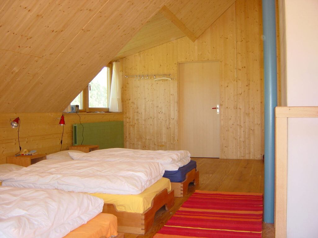 Charakteristisch für das Gebäude ist die konsequente Materialwahl – naturbelassener Stein und unbehandeltes Lärchenholz prägen das Erscheinungsbild. Die Konstruktion fügt sich selbstverständlich in die umgebende Landschaft ein und interpretiert die traditionelle Bauweise neu.
