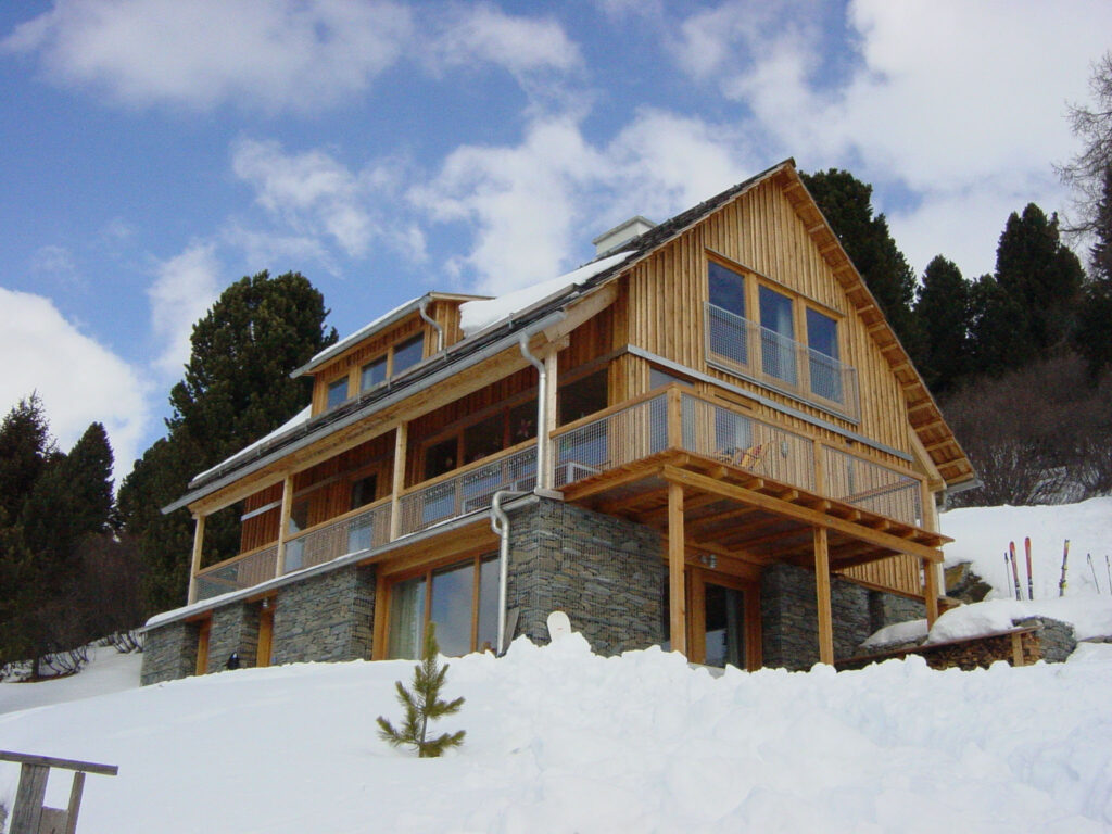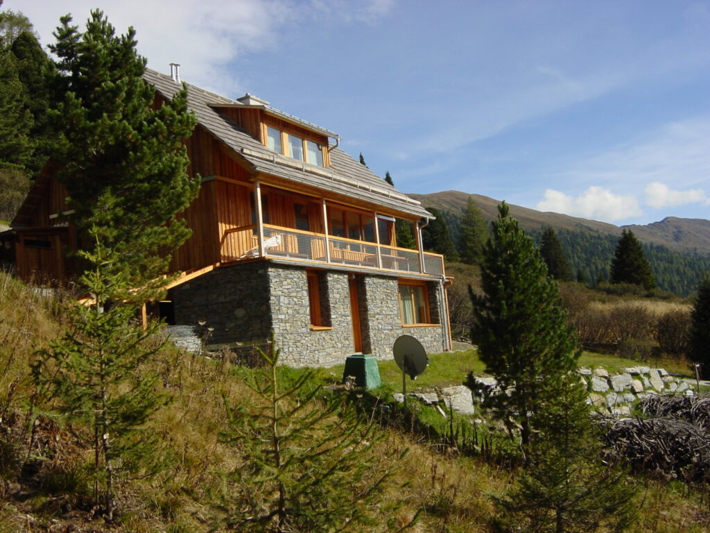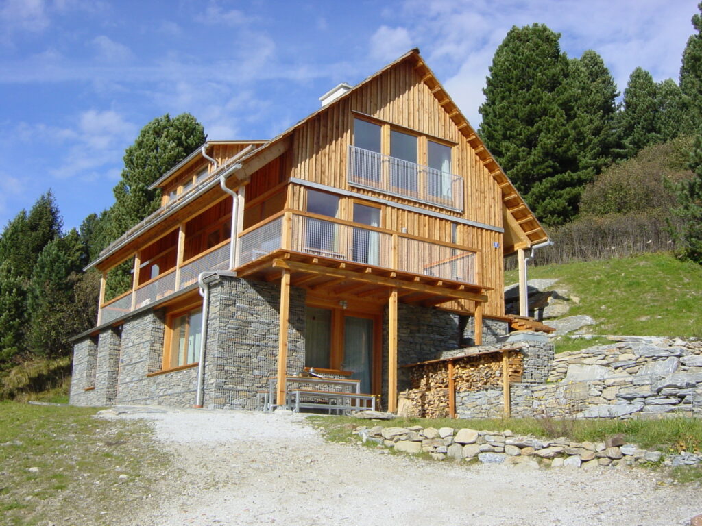 Für die Familie S. wurde auf einer Hanglage in den Bergen eine zeitgemäße Almhütte realisiert. Der Entwurf verbindet traditionelle Materialien mit einer klaren, zurückhaltenden Architektur. Die Basis des Gebäudes bildet ein Sockel aus geschichteten Natursteinmauern, die in Gabionenkörben gefasst sind. Darauf ruht ein Holzbau in regionaltypischer Ausführung.