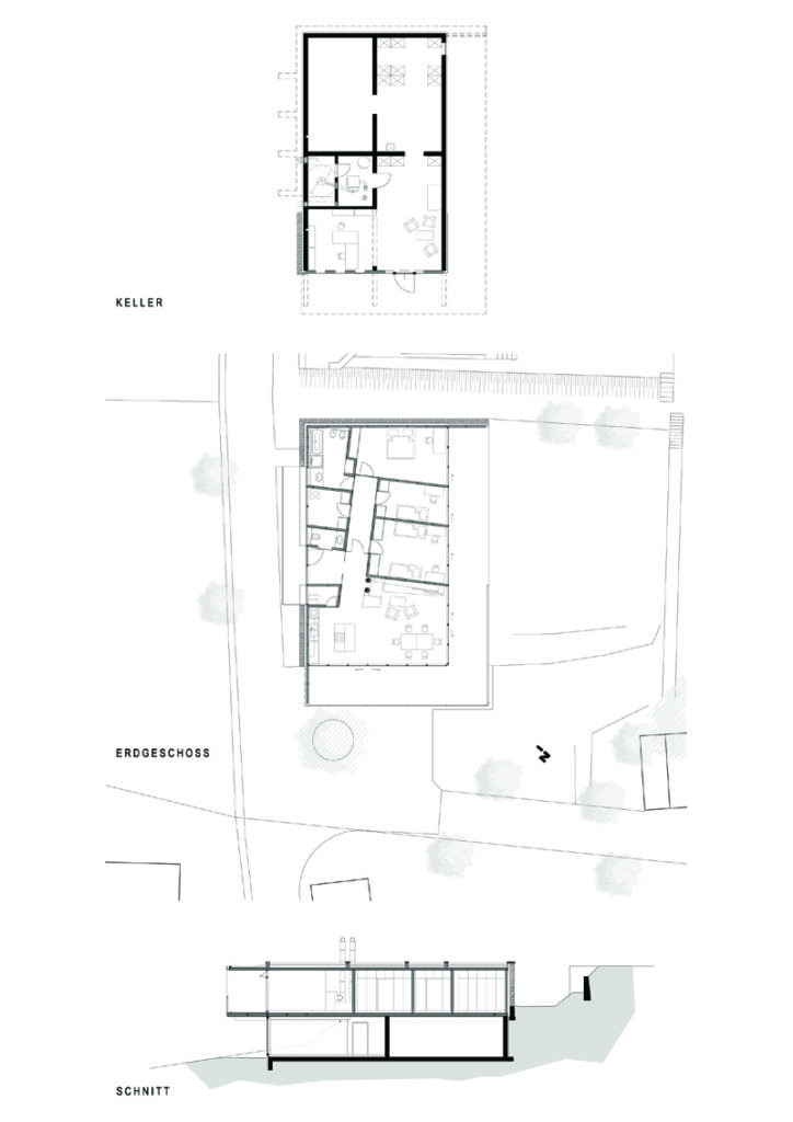 Ein Keller im Untergeschoss dient als zusätzlicher Funktionsbereich und nimmt Lager- sowie Technikräume auf.