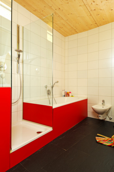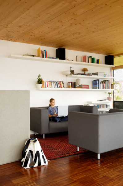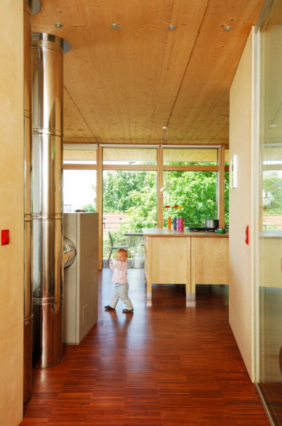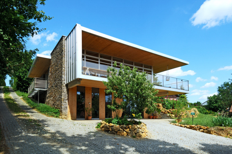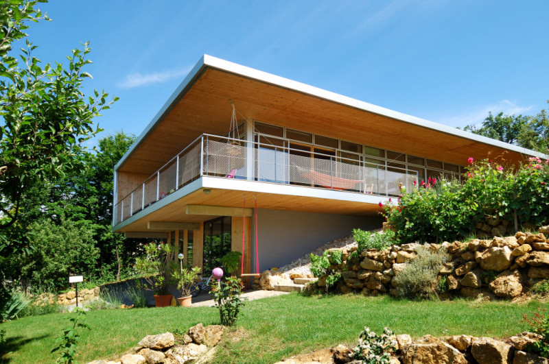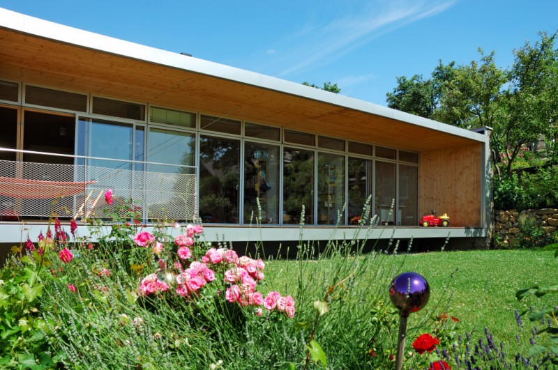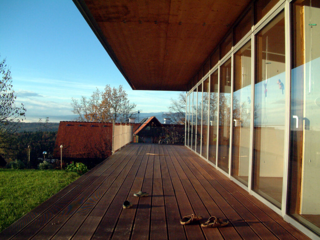 Durch das weit auskragende Vordach und Terrasse soll einerseits der empfundene Wohnraum ausgedehnt und ein überhitzen im Sommer verhindert werden. Bei tiefstehender Sonne in den Wintermonaten kann dennoch ein Energiegewinn erzielt werden.