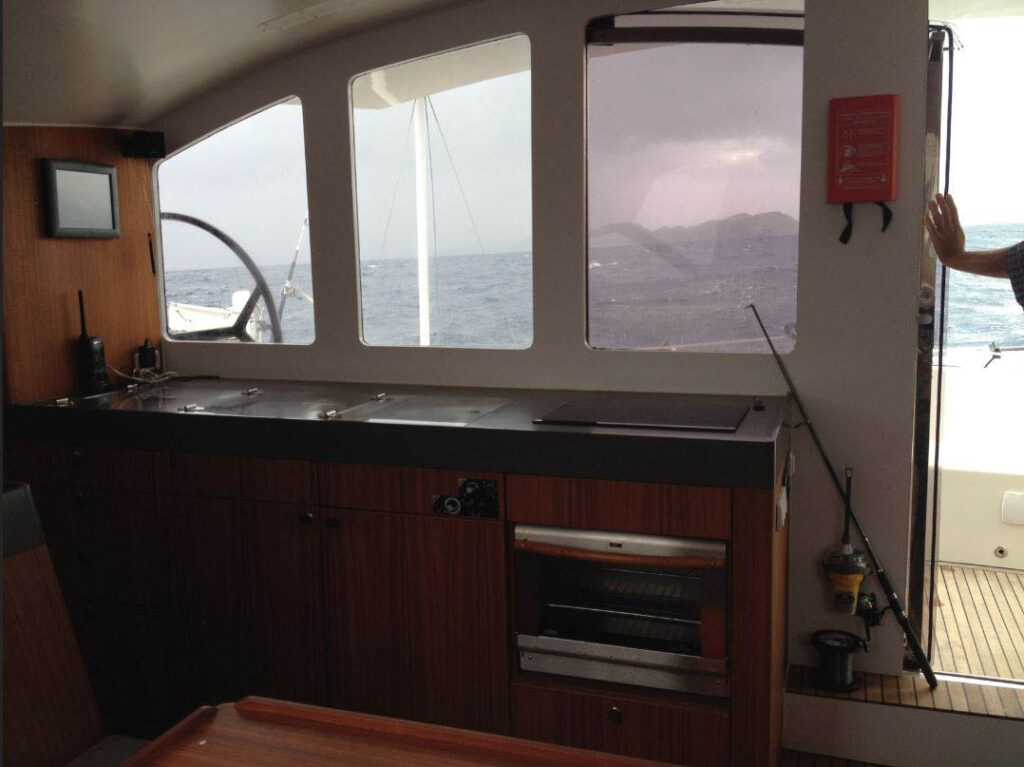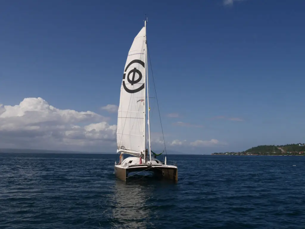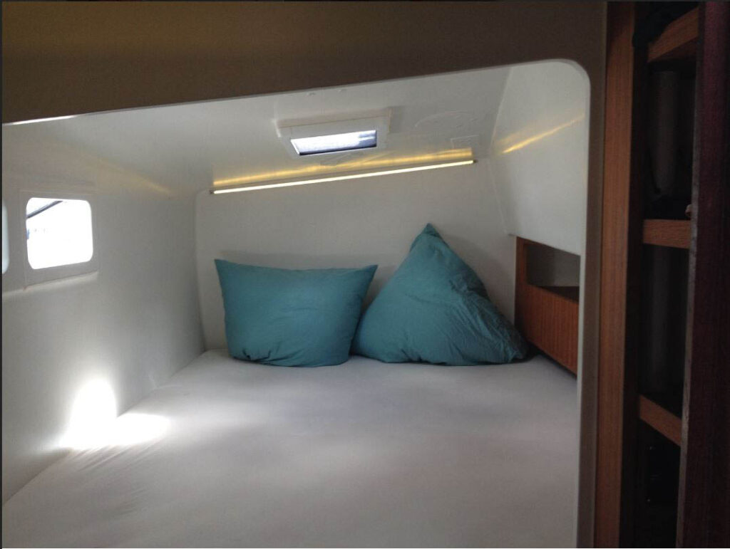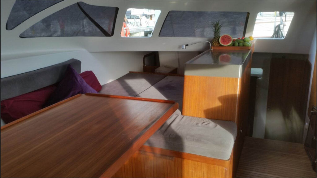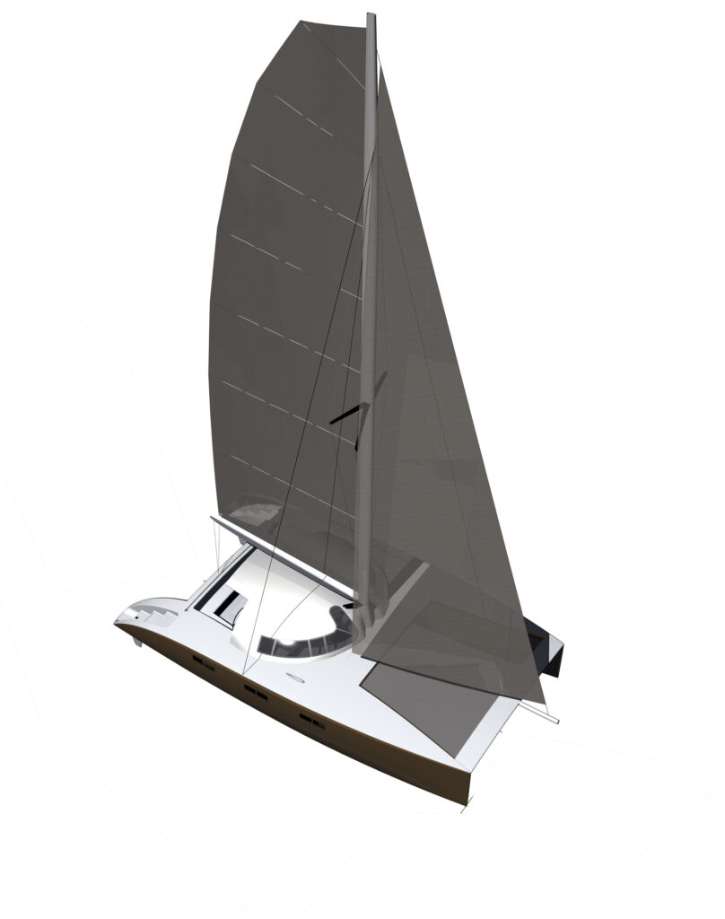 Der Katamaran ist schlank gebaut und auf gute Segeleigenschaften optimiert. Zwei schmale Rümpfe sorgen für wenig Wasserwiderstand, das Deck ist offen und übersichtlich gestaltet. Die Kabine ist funktional, bietet Schutz und bleibt trotzdem leicht und klar im Design. Das Boot lässt sich auch bei anspruchsvollen Bedingungen gut manövrieren.