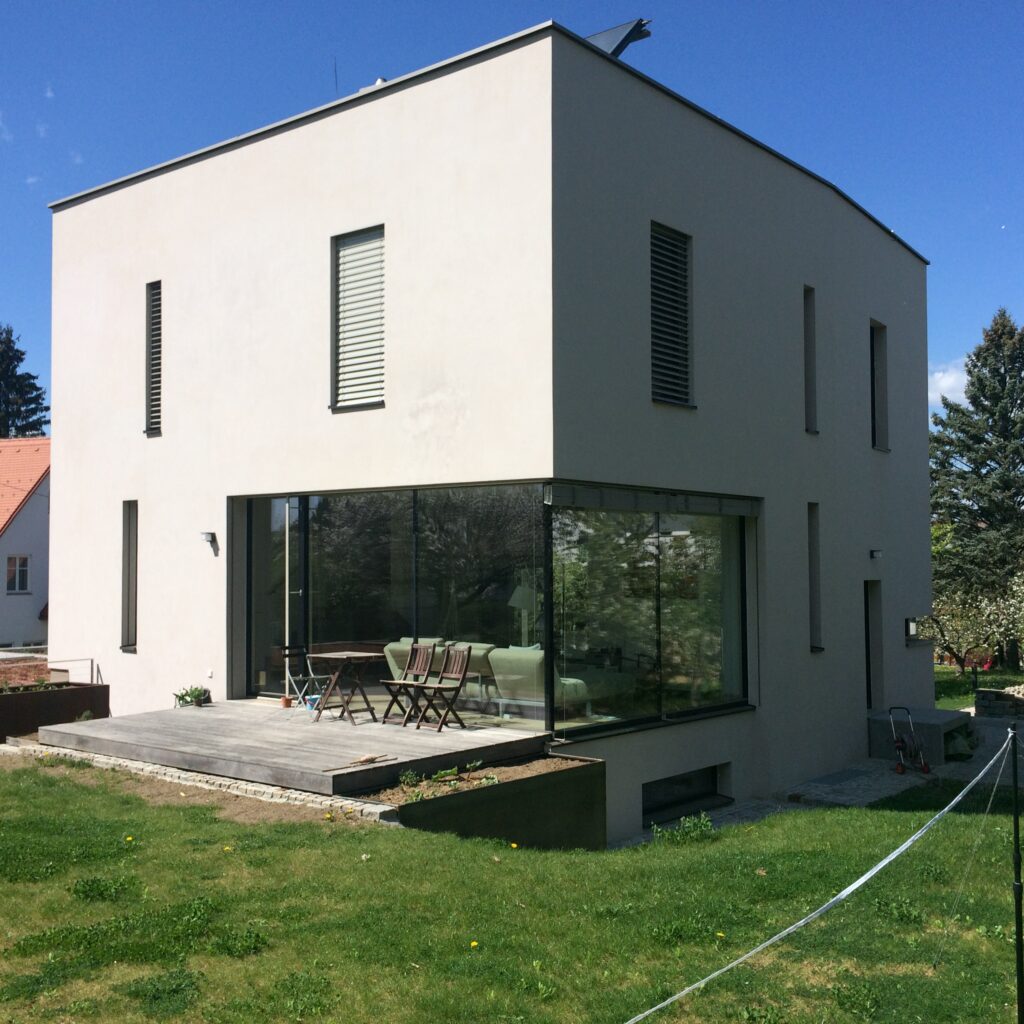 In Graz-Waltendorf wurde auf einem schwierigen, schmal zugeschnittenen Hanggrundstück ein Einfamilienhaus mit drei Geschossen realisiert. Die kompakte Kubatur von 9 × 9 × 9 Metern ergibt sich aus der Grundstücksform und den topografischen Bedingungen.