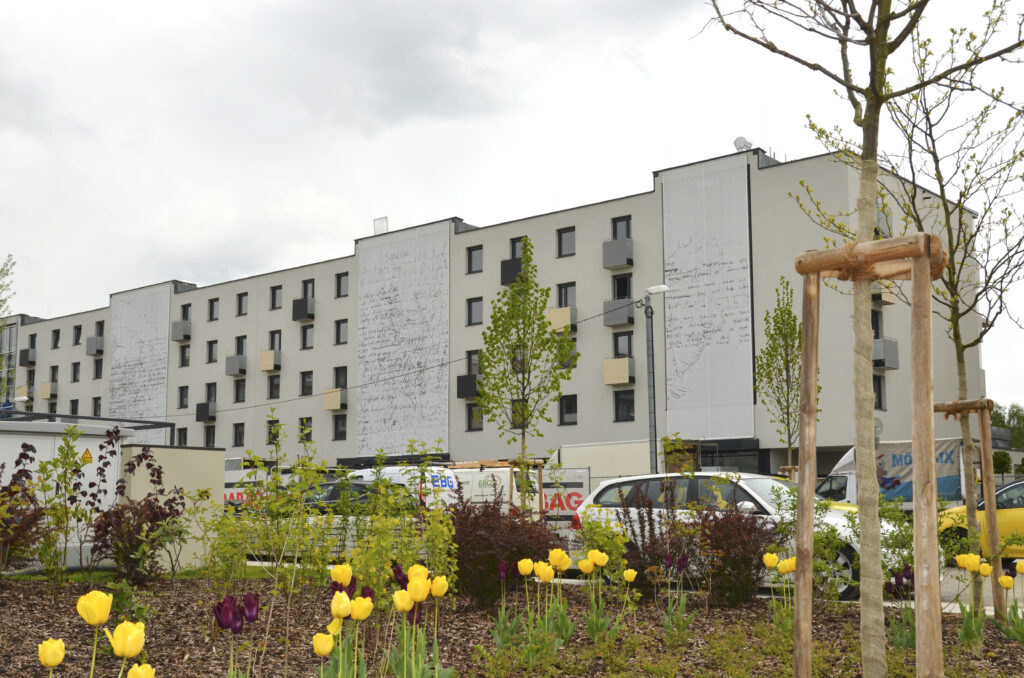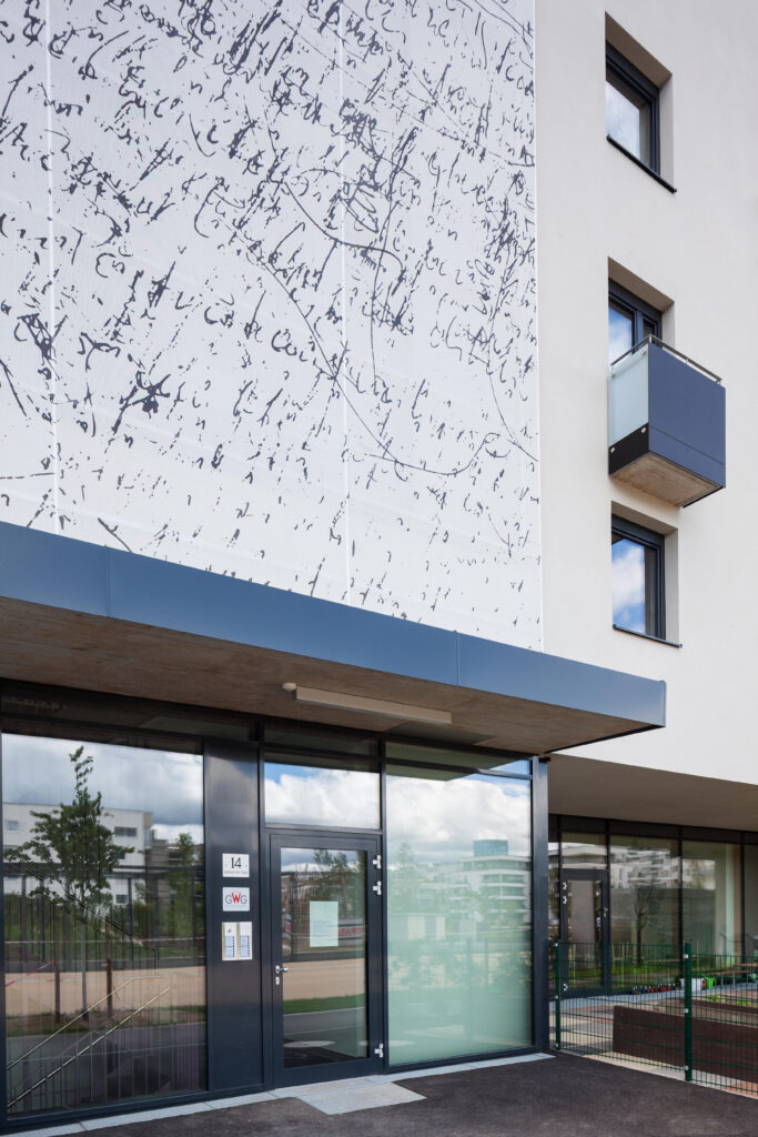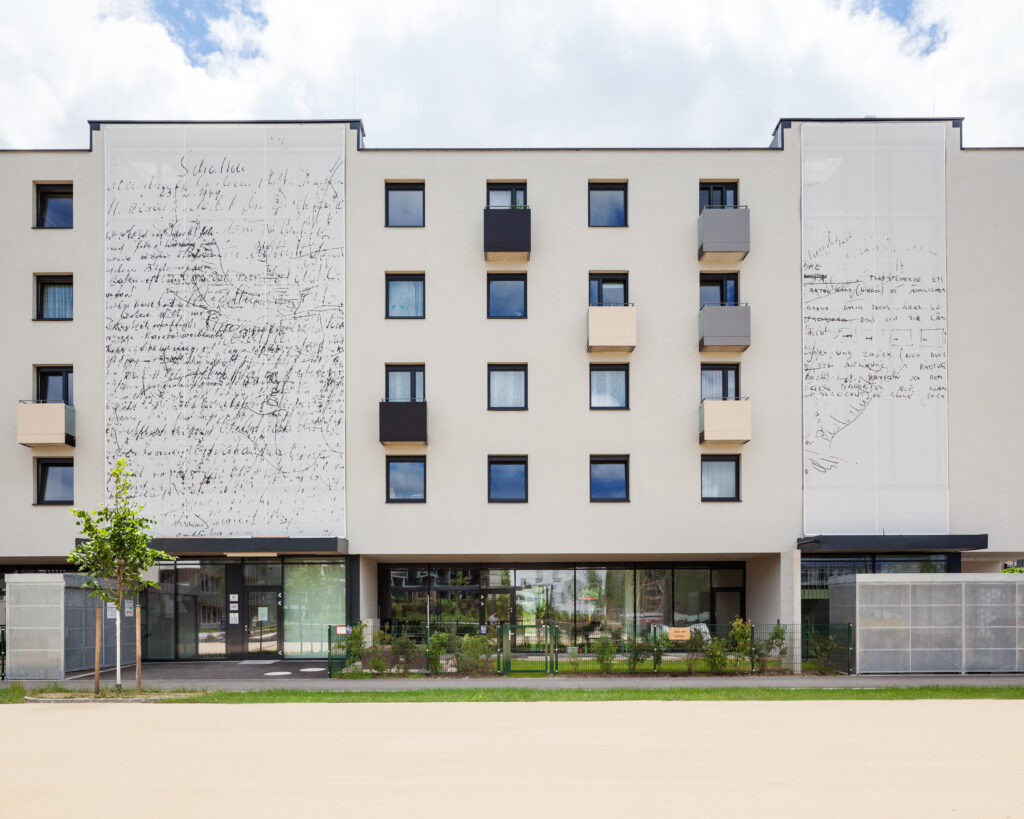 Straßenseitig setzen die transparent gestalteten Stiegenhäuser einen gestalterischen Akzent. Eine bedruckte textile Bespannung nach Entwürfen von Peter Androsch bildet einen filternden Übergang zwischen Erschließung und Außenraum. Das Kunstwerk „Schreib weise!“ findet seine Fortsetzung in den bedruckten Brüstungsfolien der Balkone.