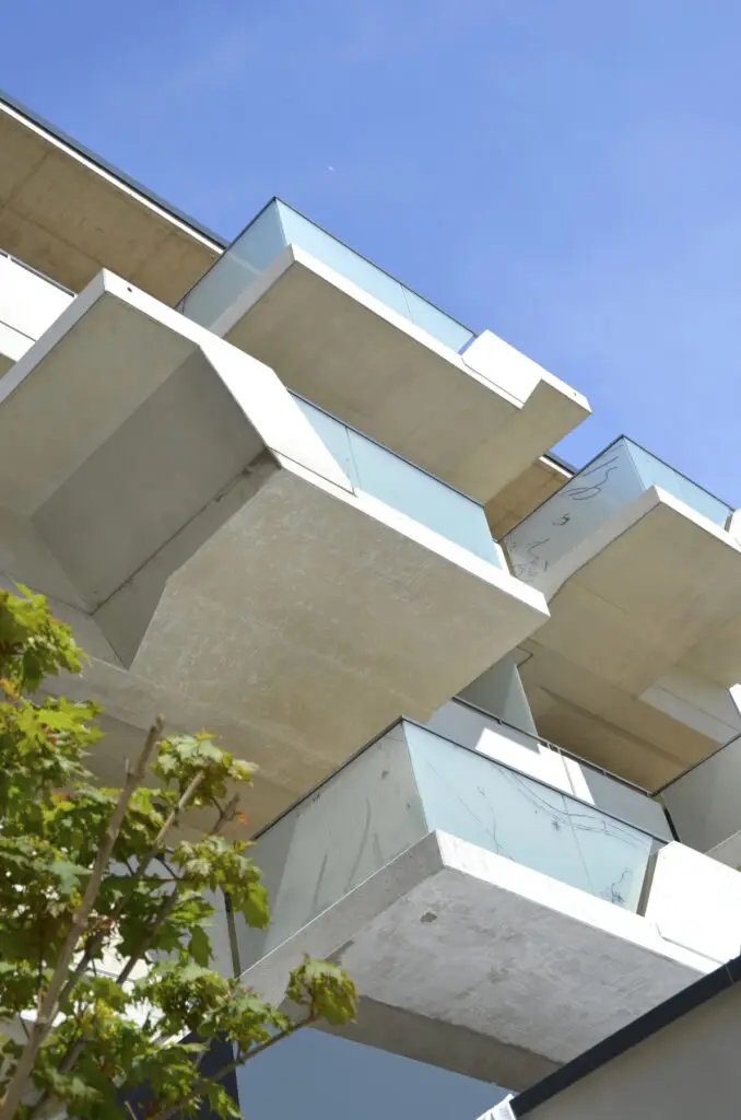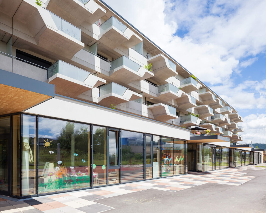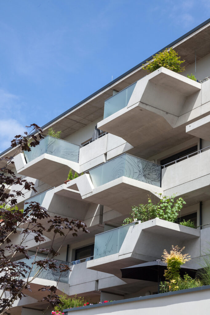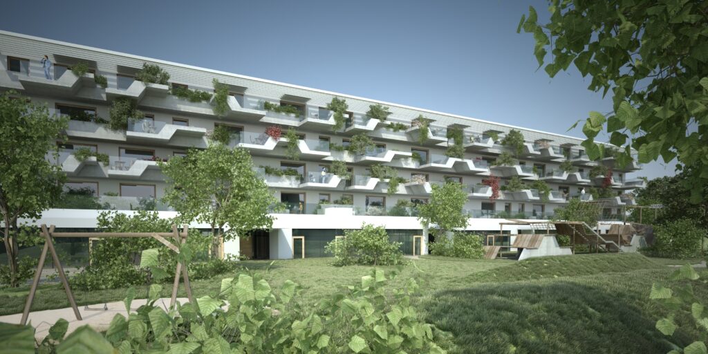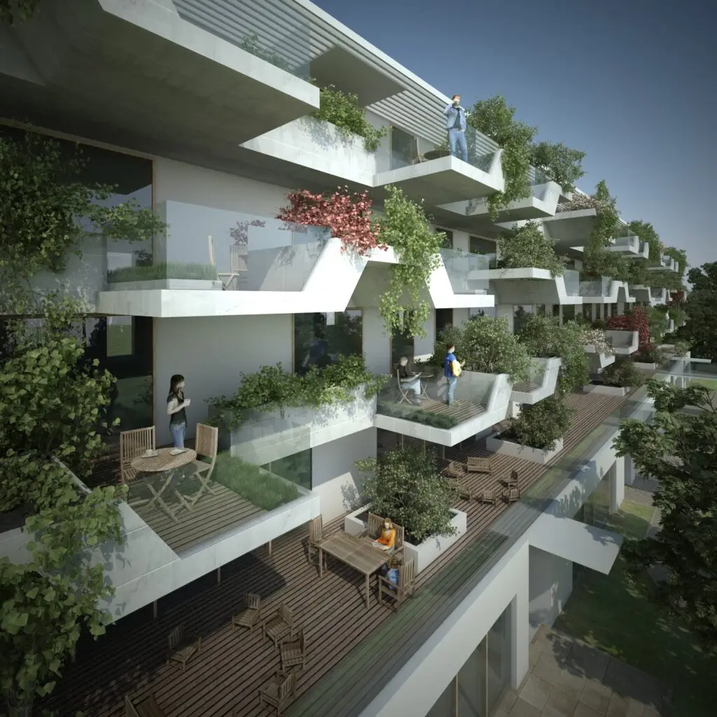 Ein wesentliches architektonisches Merkmal ist die Gestaltung der Balkone als „hängende Gärten“. Die Kombination aus vorgefertigten Betonelementen und integrierten Pflanzgefäßen sorgt für eine differenzierte Fassadengliederung mit funktionalem Mehrwert. Ergänzend dazu entstehen Dachgärten, begrünte Fassaden und ein Freiraumkonzept, welches die Außenräume strukturiert und nutzbar macht.