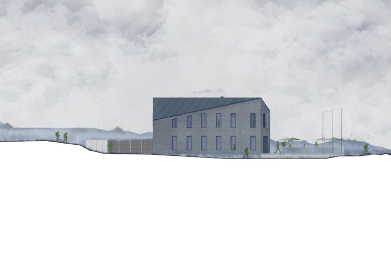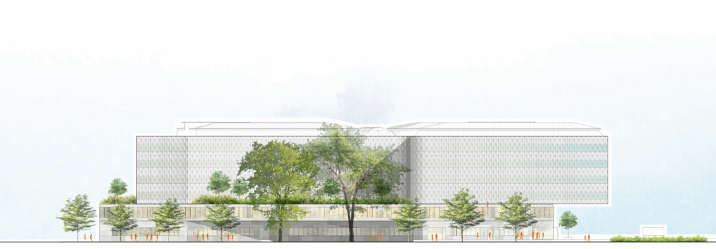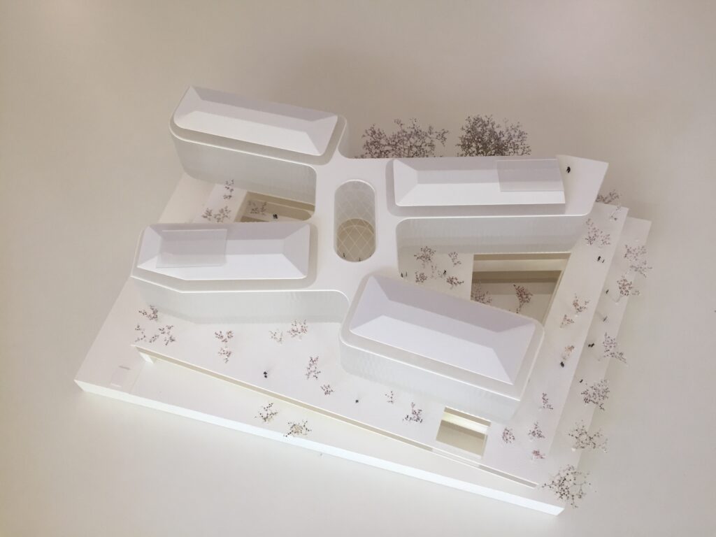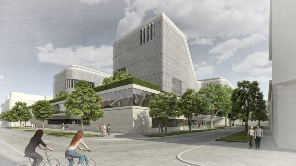Das neue Gebäude des GCP verfolgt eine funktional und städtebaulich durchdachte Architektur. Die Grundform basiert auf einer H-/X-förmigen Typologie mit vier Flügeln, die um ein zentrales Foyer gruppiert sind. Rücksprünge und Innenhöfe sorgen für Belichtung und Raumqualität. Die klare äußere Kubatur wird nach innen durch gerundete Hofseiten aufgelockert.