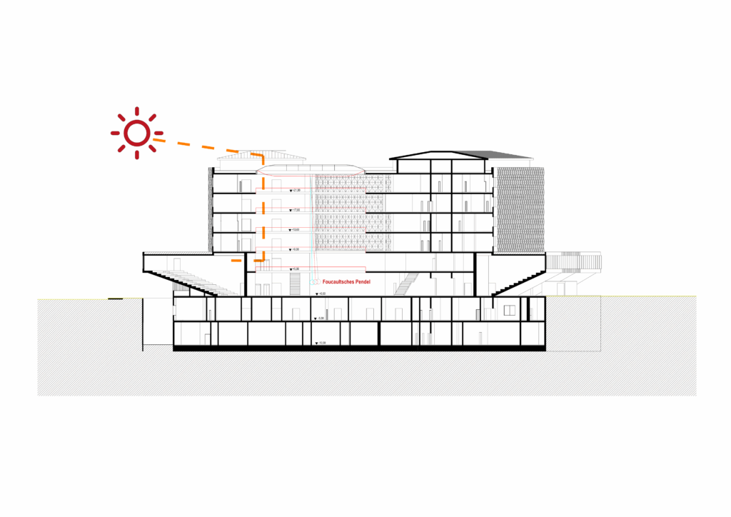 Eine zweite Hülle aus perforierten Metallblechen umspannt die Obergeschosse. Sie dient als Sonnenschutz und verweist gestalterisch auf das Wellenverhalten der Materie – ein zentrales Thema der Quantenphysik, das auch durch ein Foucault’sches Pendel im Foyer aufgegriffen wird.