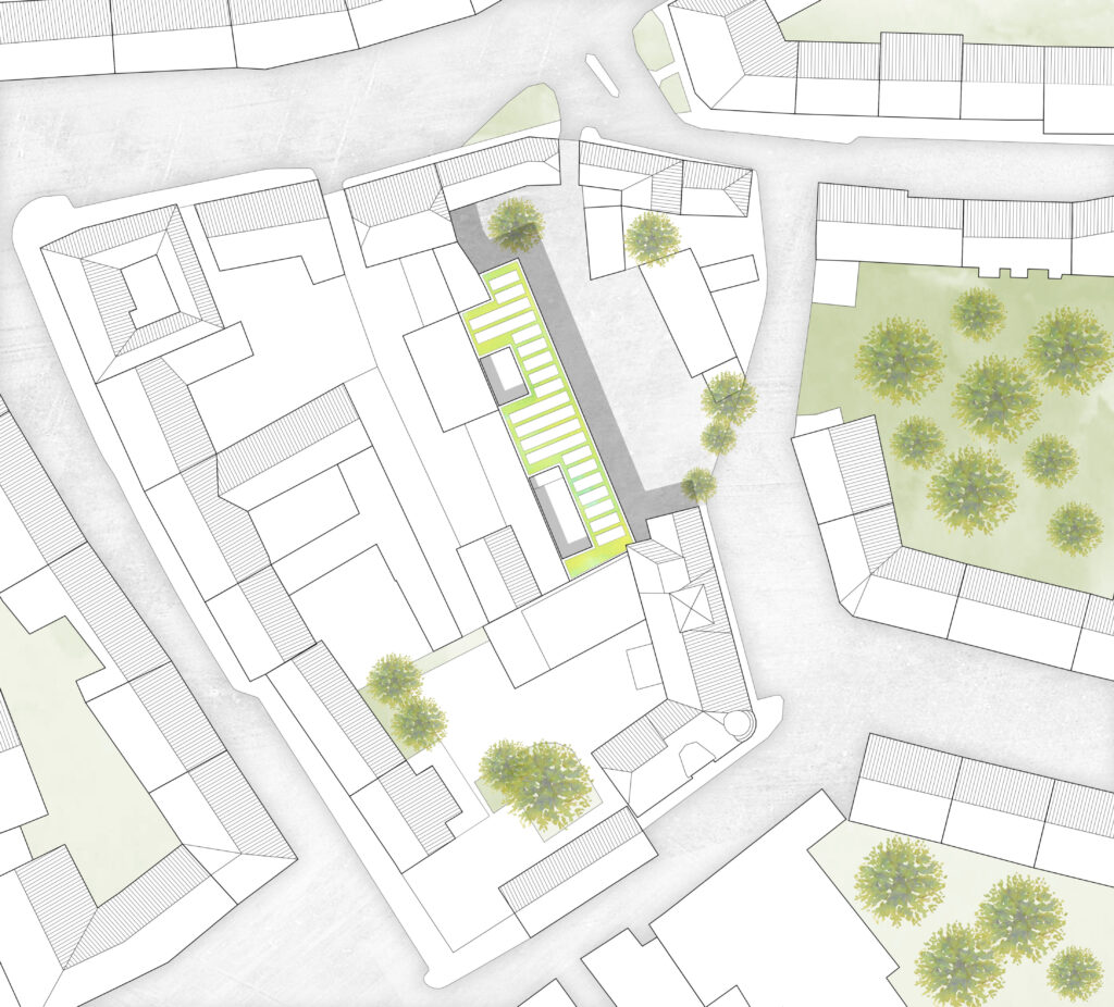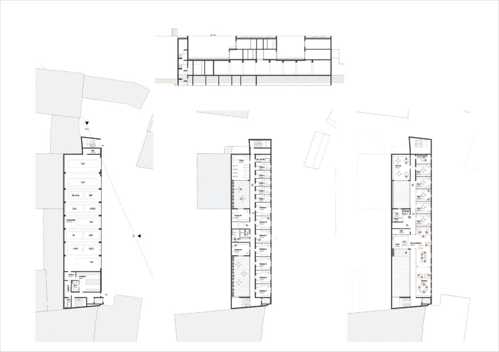 Zwei begrünte Innenhöfe sorgen für Belichtung und bieten Aufenthaltsqualität. Die Obergeschosse verfügen über Freibereiche und Terrassen. Die Fassade gliedert sich klar: eine zweigeschossige Lochfassade über der Torfront, ergänzt durch perforierte Blechmasken und gefaltete Platten aus Naturstein oder Faserzement.