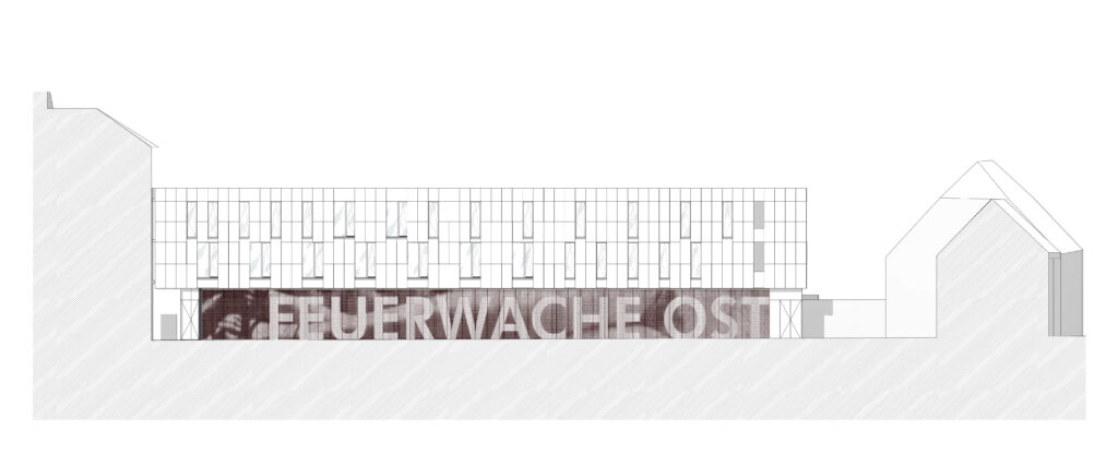 Der Entwurf für die Feuerwache Ost verbindet Funktionalität, Wirtschaftlichkeit und klare Architektur. Die Fahrzeughalle bestimmt den Grundriss des Erdgeschosses. Zwei Treppenhäuser und ein zentrales Gangsystem erschließen die angrenzenden Bereiche effizient.